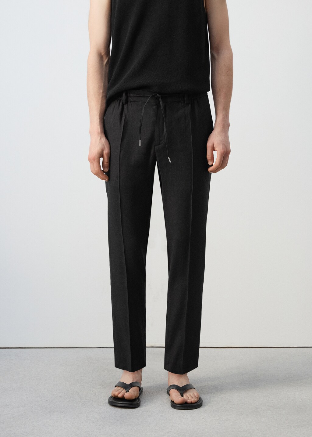 Slim fit. Largo Crop. Tejido mezcla de lino. Cintura elástica con cordón ajustable. Cordón con opción de anudado visible u oculto en el interior. Trabillas para cinturón. Dos bolsillos laterales. Cierre delantero de cremallera y botón