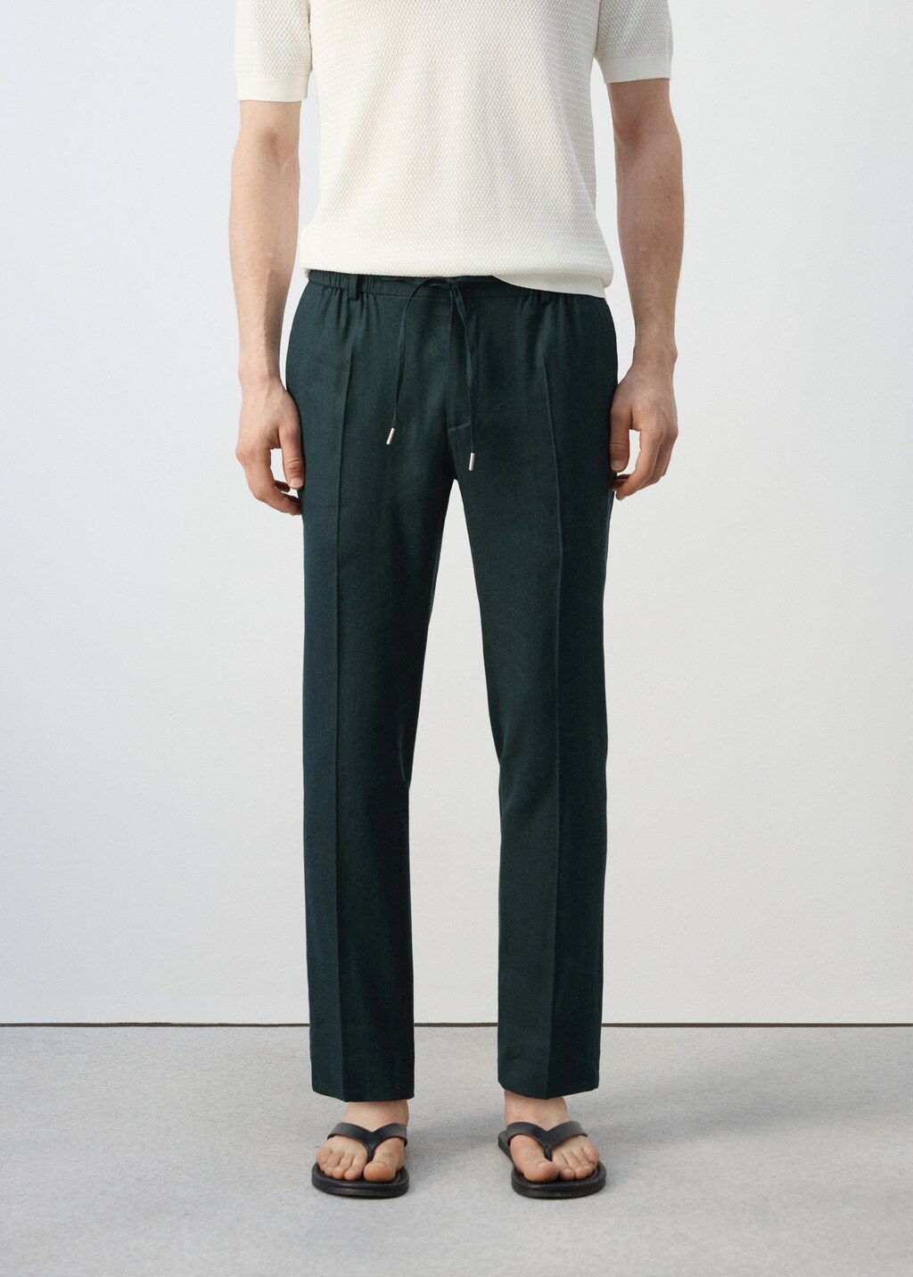Slim fit. Largo Crop. Tejido mezcla de lino. Cintura elástica con cordón ajustable. Cordón con opción de anudado visible u oculto en el interior. Trabillas para cinturón. Dos bolsillos laterales. Cierre delantero de cremallera y botón
