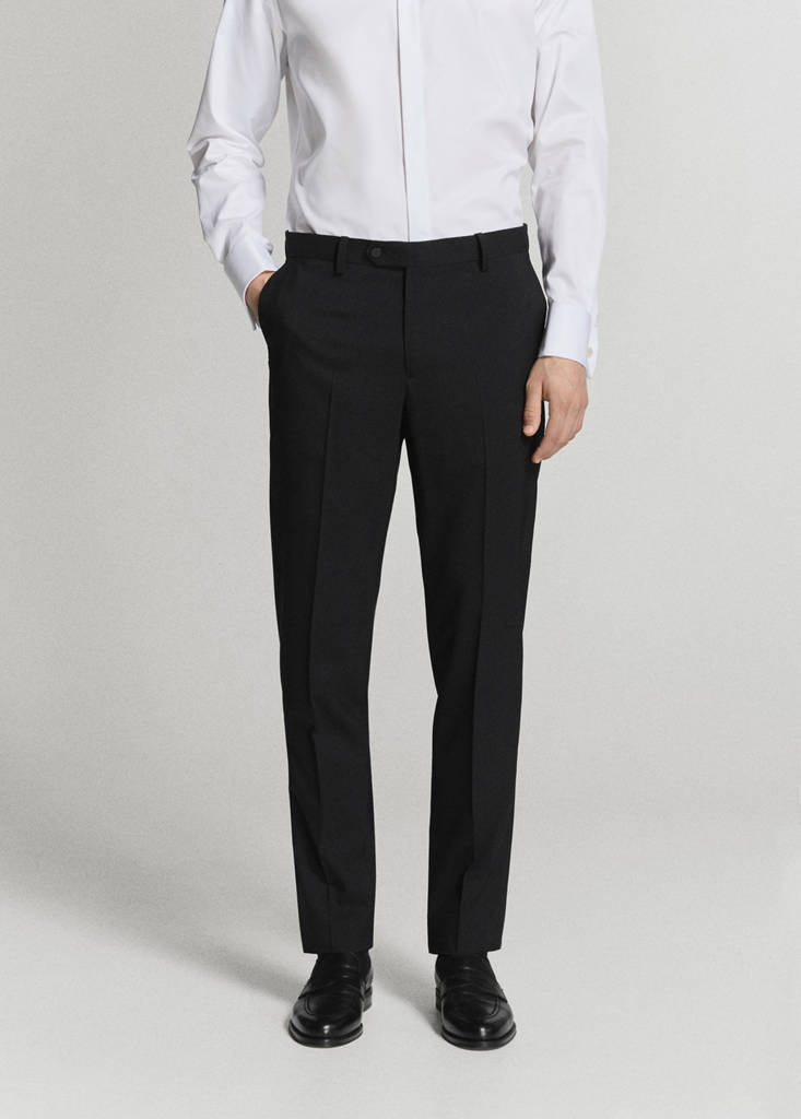 Slim fit. Tejido 100% lana. Trabillas para cinturón. Cierre delantero de doble botonadura y cremallera. Detalle de pinzas delanteras. Dos bolsillos laterales. Dos bolsillos de ribete y botón en la parte posterior. Detalle de raya planchada en la parte delantera y trasera