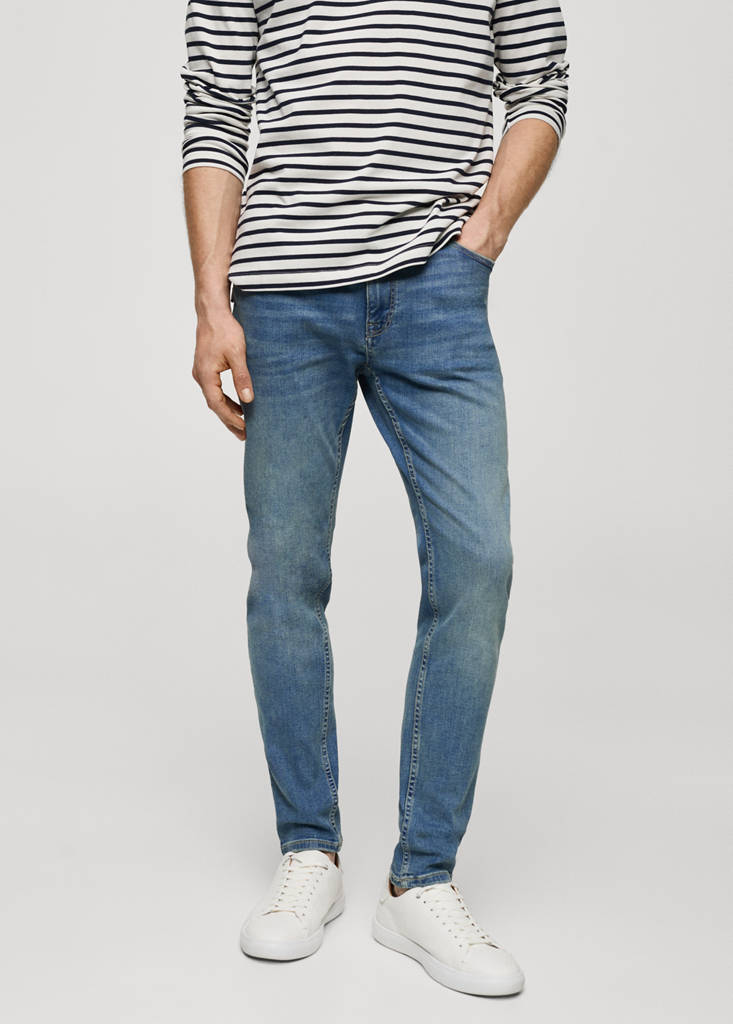 Corte skinny: el tipo de jeans más ajustado. Tejido de algodón. Estilo tejano vaquero. Tiro medio. Trabillas para cinturón. Cierre de cremallera y botón. Bolsillo portamonedas. Dos bolsillos de parche en la parte posterior