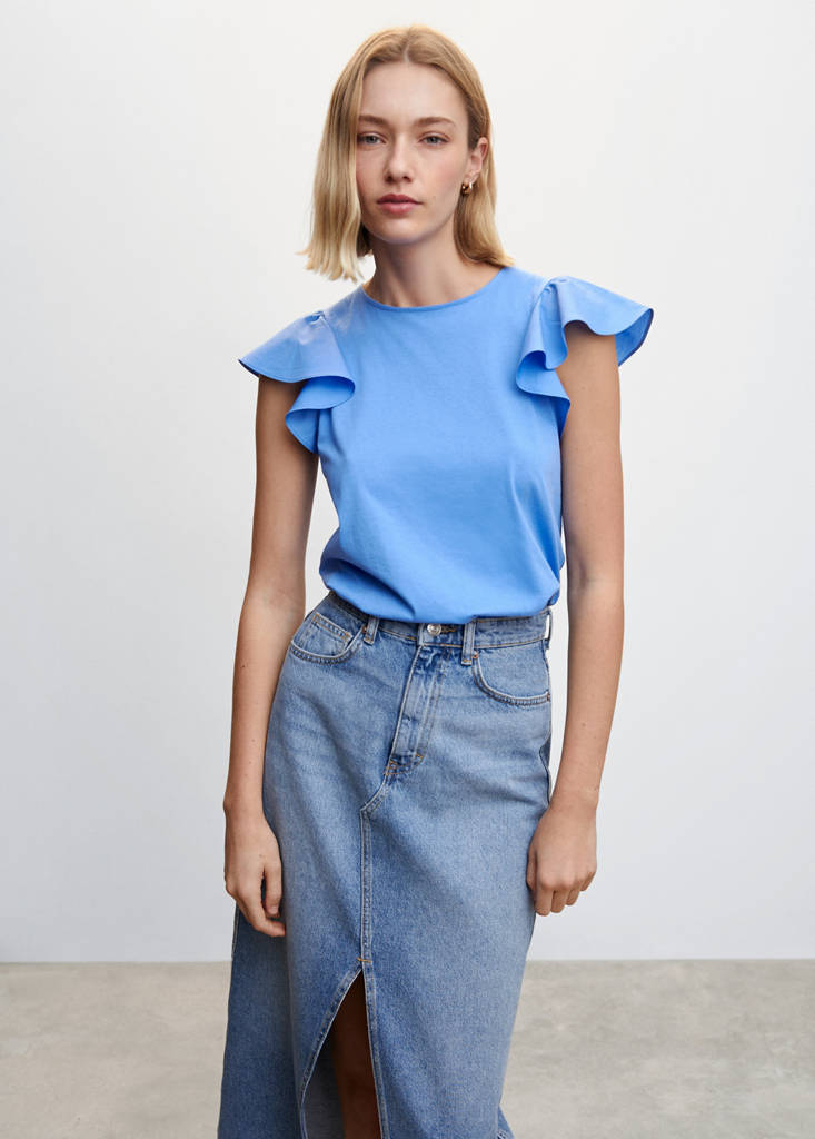 Camiseta manga volantePrecio actual [12.900,00 XAF ]12.900,00 XAFSelecciona un colorAzulLa modelo lleva la talla S y mide 180cm.Selecciona tu tallaXXSNo disponible ¡Lo quiero!XSNo disponible ¡Lo quiero!SNo disponible ¡Lo quiero!MNo disponible ¡Lo quiero!LNo disponible ¡Lo quiero!XLNo disponible ¡Lo quiero!XXLNo disponible ¡Lo quiero!MedidasAvísameAñadir a FavoritosVer lookEnvío gratis a tiendaTejido 100% algodón. Diseño recto. Cuello redondo. Manga corta con volante. Sin cierreDetalles, composición y cuidadosDisponibilidad en tienda