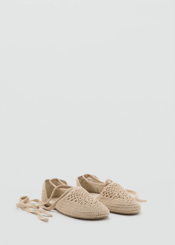 Tejido de crochet. Cuerda ajustable en la parte posterior. Puntera redondeada. Suela de goma