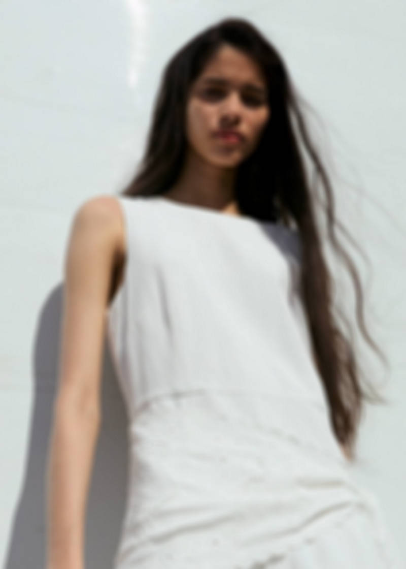 Tejido mezcla de lino. Diseño midi. Diseño evasé. Cuello redondo. Sin mangas. Tirante ancho. Detalle de pañuelo en la cintura. Cierre de cremallera lateral. Disponible Plus