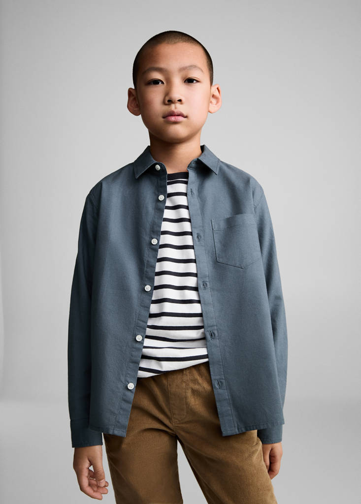 100% algodón. Regular fit. Diseño recto. Cuello camisero. Manga larga con puños abotonados. Bolsillo de parche. Cierre de botones en la parte posterior