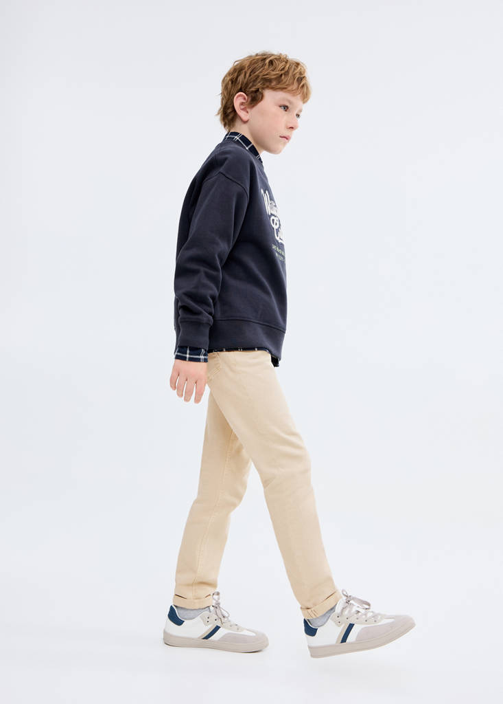 Tejido de algodón. Tejido elástico. Estilo tejano vaquero. Diseño largo. Diseño recto. Trabillas para cinturón. Cierre de botón y cremallera. Dos bolsillos laterales. Bolsillo portamonedas. Bajo con vuelta. Back to school