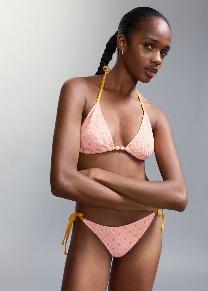Tejido con textura. Silueta Triangulo. Diseño estampado. Diseño bicolor. Cierre de lazo. Detalle lazos ajustables. Braguita media. Colección baño