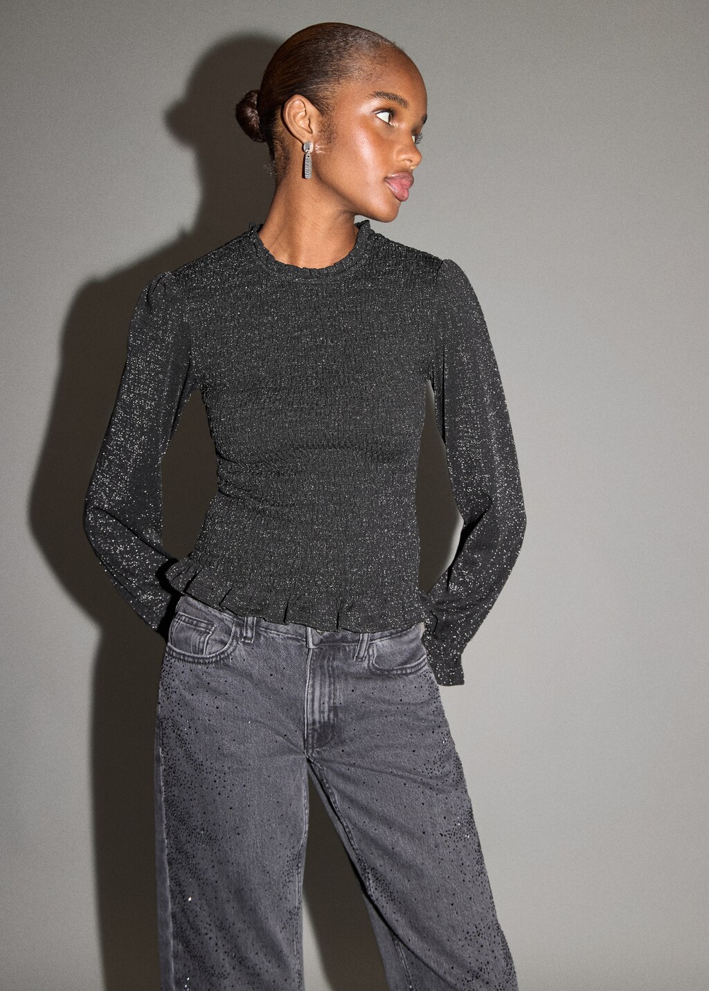Tejido de lúrex. Tejido fruncido nido de abeja. Silueta Slim. Cuello redondo volante. Manga larga abullonada. Puños con volante. Bajo con volante. Cierre de lágrima en la parte posterior. Colección fiesta y eventos. Party Collection. Colección Navidad. Diseño brillo.