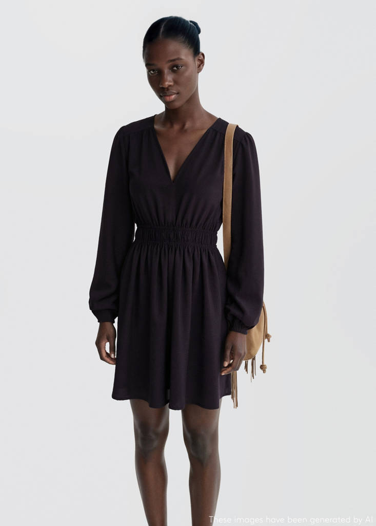 Tejido fluido. Tejido de viscosa. Diseño corto. Cuello pico. Manga larga con puños elásticos y fruncidos. Panel fruncido en la cintura