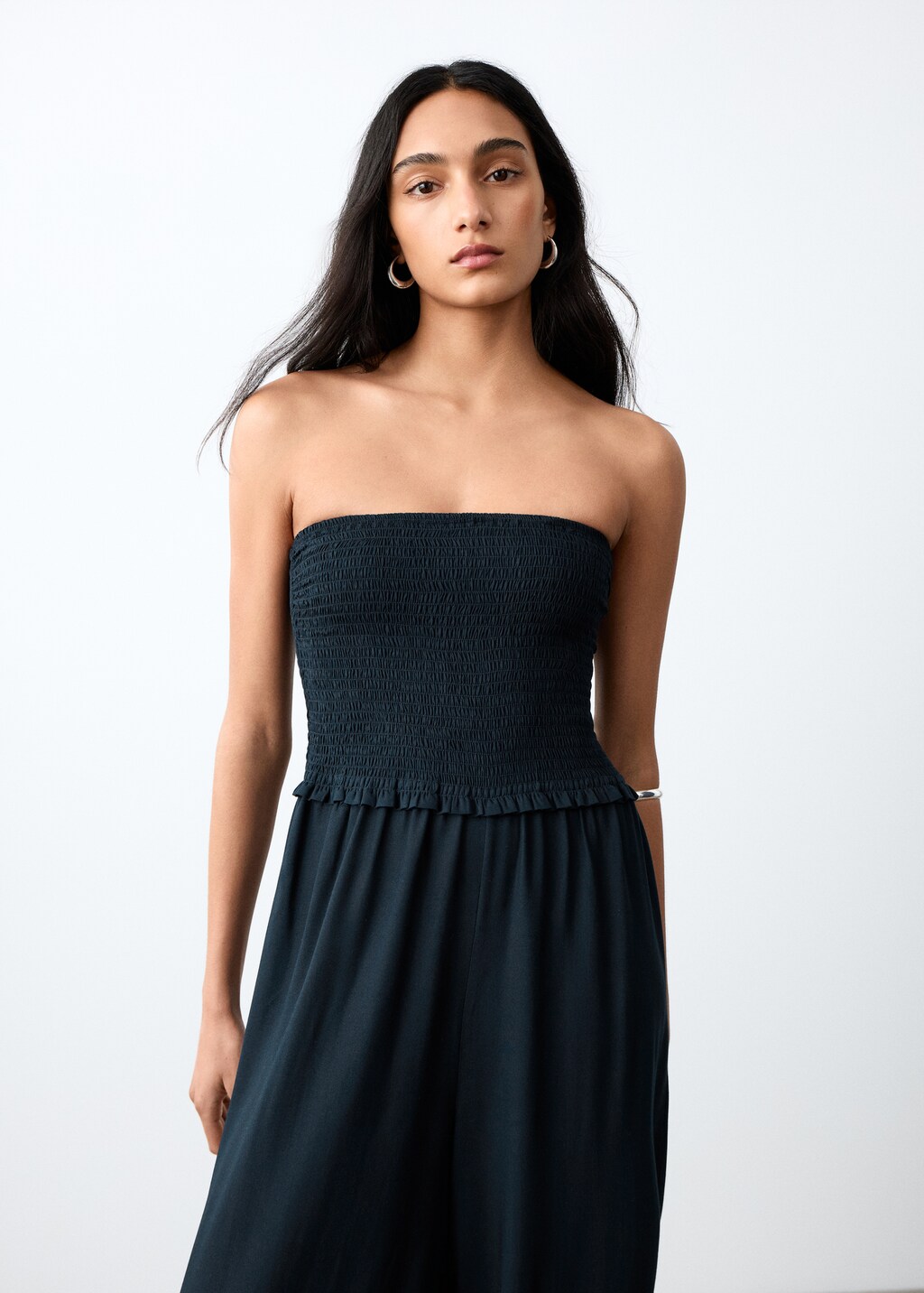 Tejido fluido. Diseño mono. Diseño recto. Diseño largo. Palabra de honor. Detalle fruncido en el pecho. Bajo elástico. Detalle de lazos en el bajo.