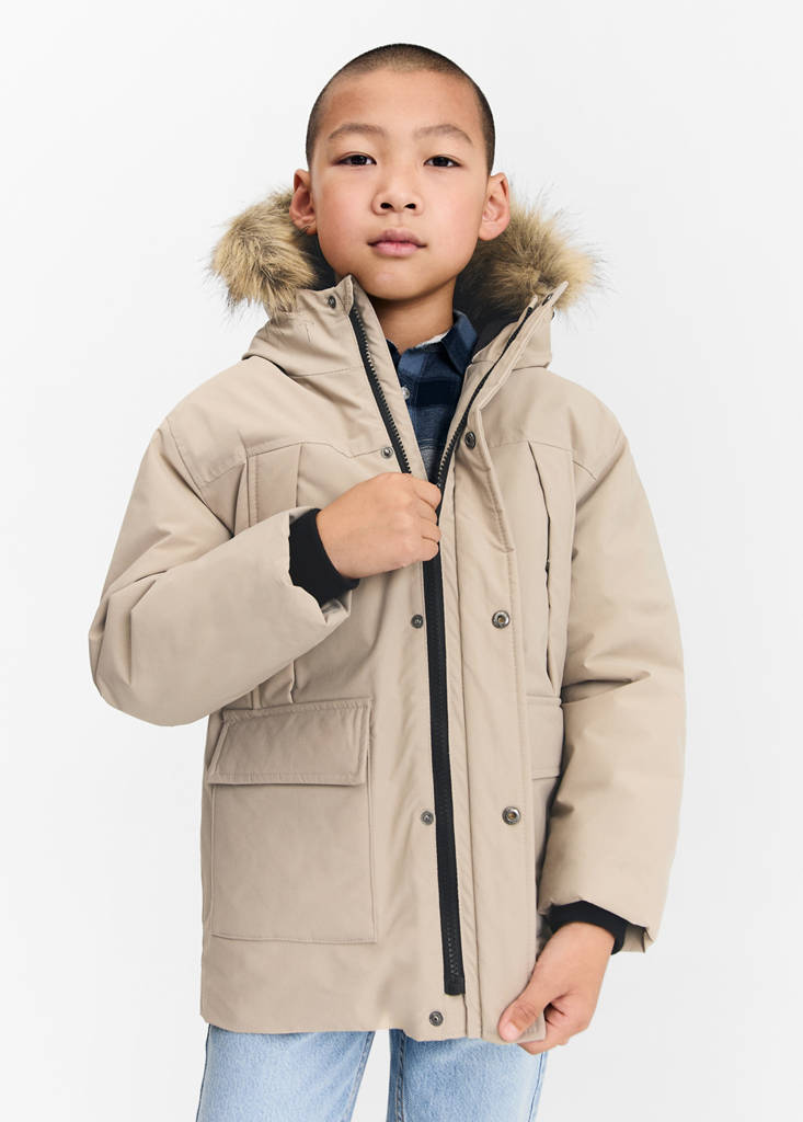 Συλλογή Επιστροφή στο σχολείο. Ψηλός λαιμός. Κουκούλα με αφαιρούμενη συνθετική γούνα. Κλείσιμο με φερμουάρ και κουμπί. Ετικέτα για προσωπικά στοιχεία. Κλείσιμο με φερμουάρ και σούστες. Ίσιο σχέδιο. Μακρύ μανίκι. Καπιτονέ σχέδιο. Τέσσερις τσέπες. Εσωτερική φόδρα
