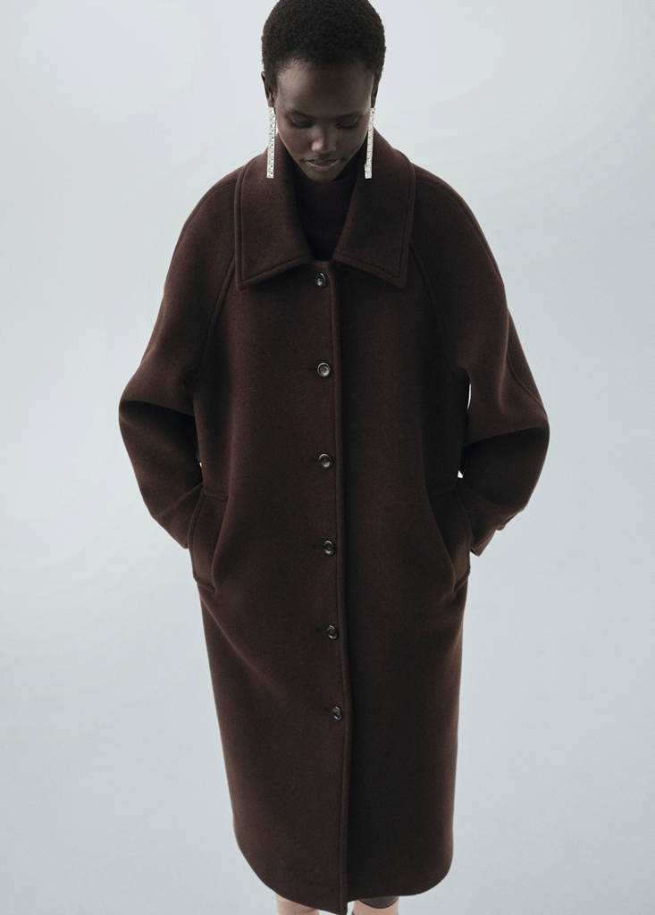 Φτιαγμένο από μάλλινο ύφασμα, αυτό το μακρύ και ίσιο σχέδιο διαθέτει γιακά πουκαμίσου και μακριά μανίκια. Περιλαμβάνει δύο πλαϊνές τσέπες και μπροστινό κλείσιμο με κουμπιά. Κολεξιόν Selection