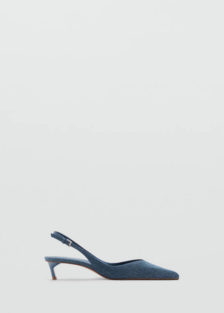 Βαμβακερό ύφασμα σε στυλ τζιν καουμπόι. Με κέντημα. Τακούνι kitten. Κλείσιμο με λουρί με αγκράφα