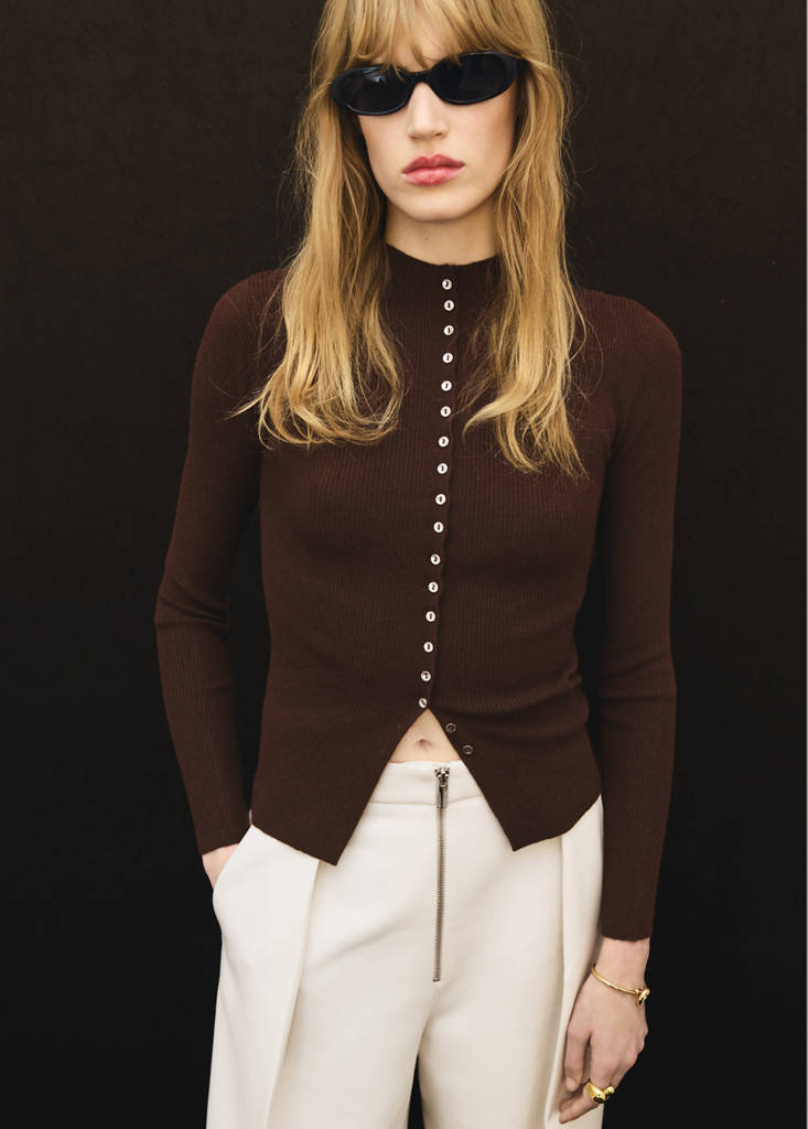 Φτιαγμένη από ύφασμα σε μίξη μαλλιού, αυτή η ζακέτα έχει λεπτή πλέξη rib. Το εφαρμοστό της στιλ συμπληρώνεται από στρογγυλή λαιμόκοψη και μακριά μανίκια. Το μπροστινό κλείσιμο με κουμπιά προσθέτει λειτουργικότητα