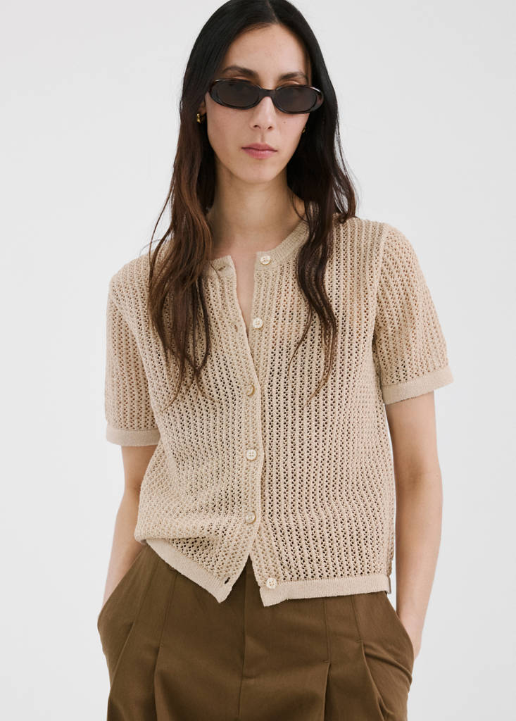 Μέτριο πλεκτό ύφασμα. Κεντημένες λεπτομέρειες. Ίσιο σχέδιο. Στρογγυλή λαιμόκοψη. Κοντά μανίκια. Μπροστινό κλείσιμο με κουμπιά