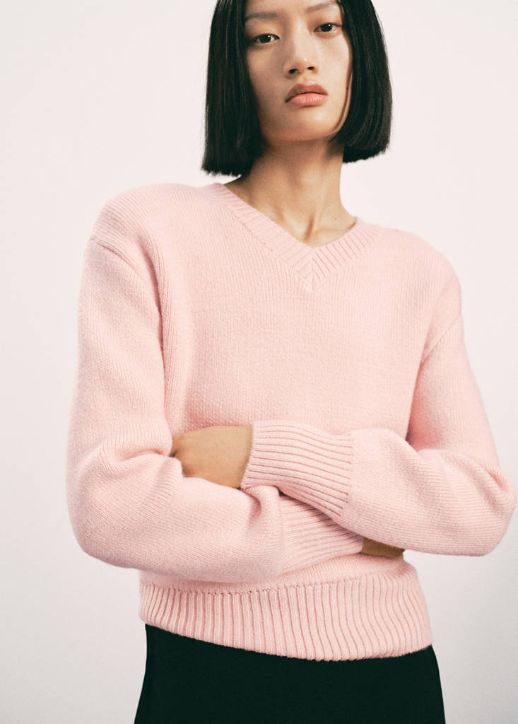 Φτιαγμένο από πλεκτό ύφασμα μεσαίου πάχους, αυτό το ίσιο σχέδιο διαθέτει λαιμόκοψη V και μακριά μανίκια