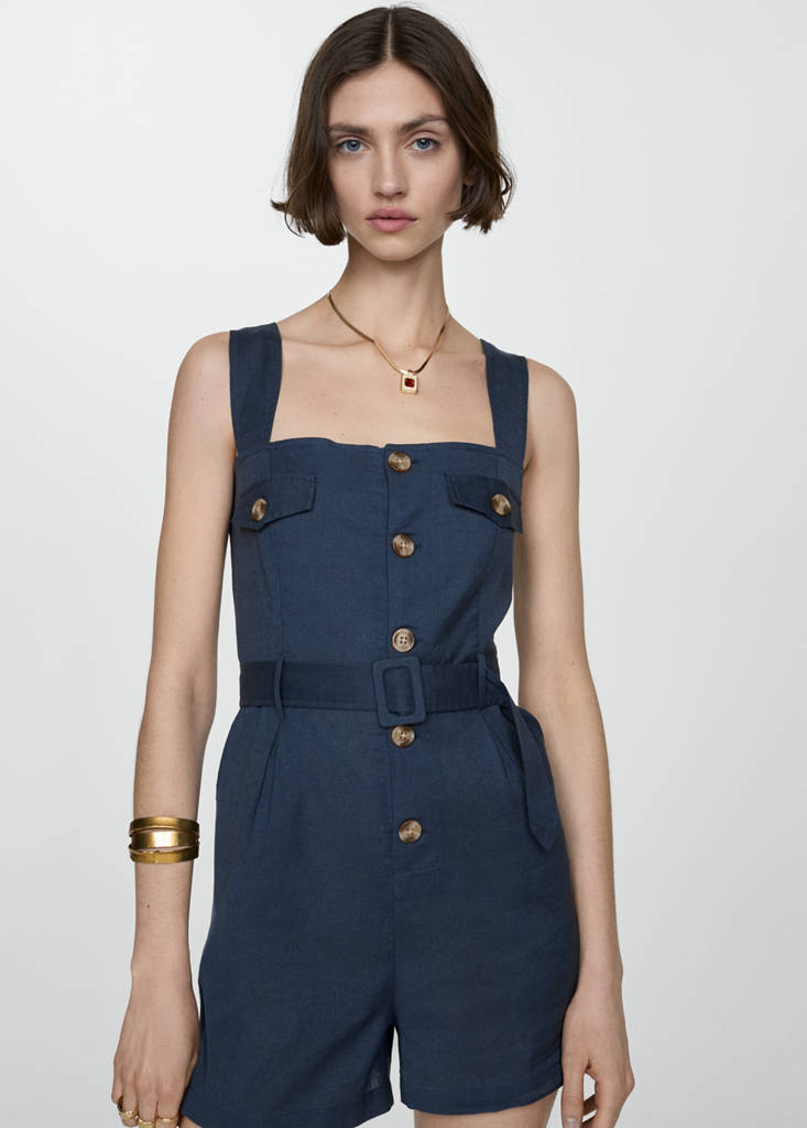 Ύφασμα μείγμα βαμβακιού. Κοντό σχέδιο. Ίσιο σχέδιο. Ντεκολτέ τετράγωνο. Φαρδιές τιράντες. Θηλιές ζώνης. Ζώνη που αφαιρείται. Κλείσιμο με κουμπιά στο μπροστινό μέρος. Δύο τσέπες με καπάκι μπροστά