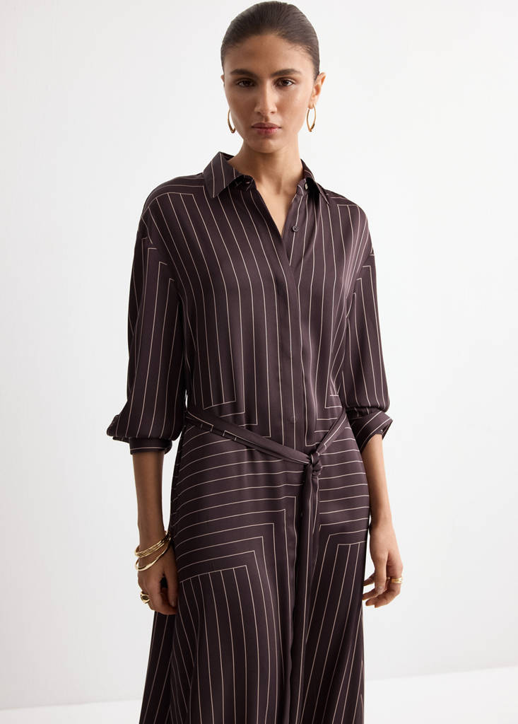 Ίσιο σχέδιο. Μακρύς σχεδιασμός. Στάμπες γεωμετρικές. Γιακάς πουκαμίσου. Μακρύ μανίκι με κουμπωτές μανσέτες. Κλείσιμο με κουμπιά. Κλείσιμο με ζώνη στη μέση
