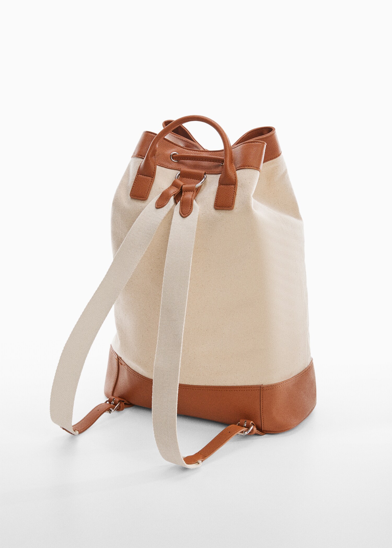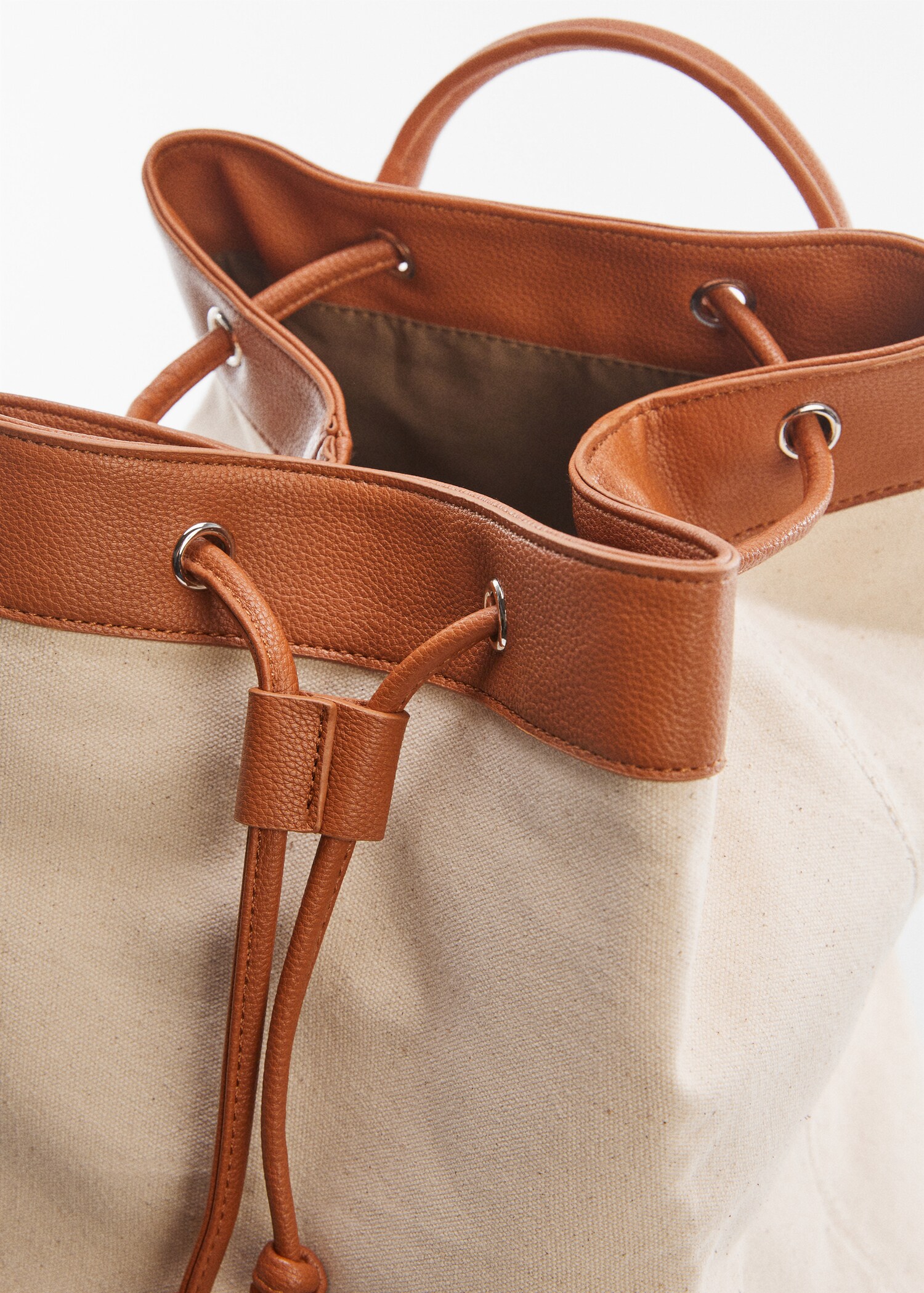 Μεσαίο μέγεθος. Σχέδιο με συνδυασμό. Βαμβακερό ύφασμα. Λεπτομέρειες με δερμάτινο αποτέλεσμα. Κλείσιμο με κορδόνια. Εσωτερική τσέπη με φερμουάρ.
