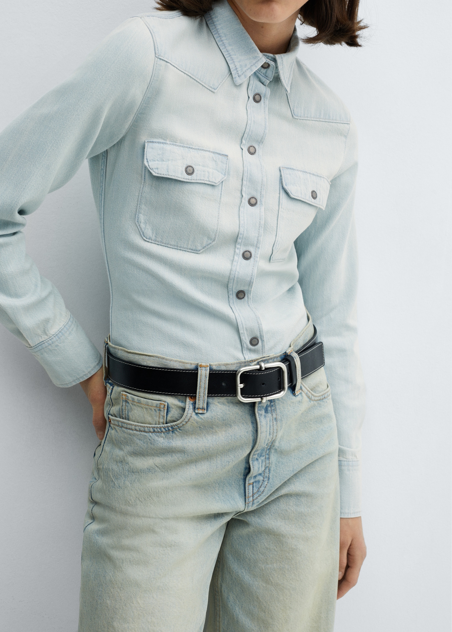 Ύφασμα βαμβακερό τύπου denim. Σχέδιο εφαρμοστό. Γιακάς πουκαμίσου. Μακρύ μανίκι με κουμπωτές μανσέτες. Δύο τσέπες με κουμπί στο στήθος. Κλείσιμο μπροστά με κουμπιά.
