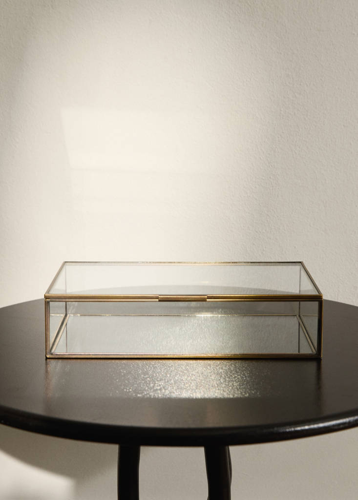 Διαστάσεις: 23x14x5,5 εκ. Χρυσό μεταλλικό περίγραμμα. Ορθογώνιο σχήμα με απλό και μοντέρνο σχέδιο. Διαφανής σχεδίαση. Με καπάκι. Χρησιμεύει για αποθήκευση, ως κοσμηματοθήκη και ως διακοσμητικό αντικείμενο. Συνδυάζεται με περισσότερα προϊόντα της συλλογής. Διαθέσιμη σε δύο μεγέθη