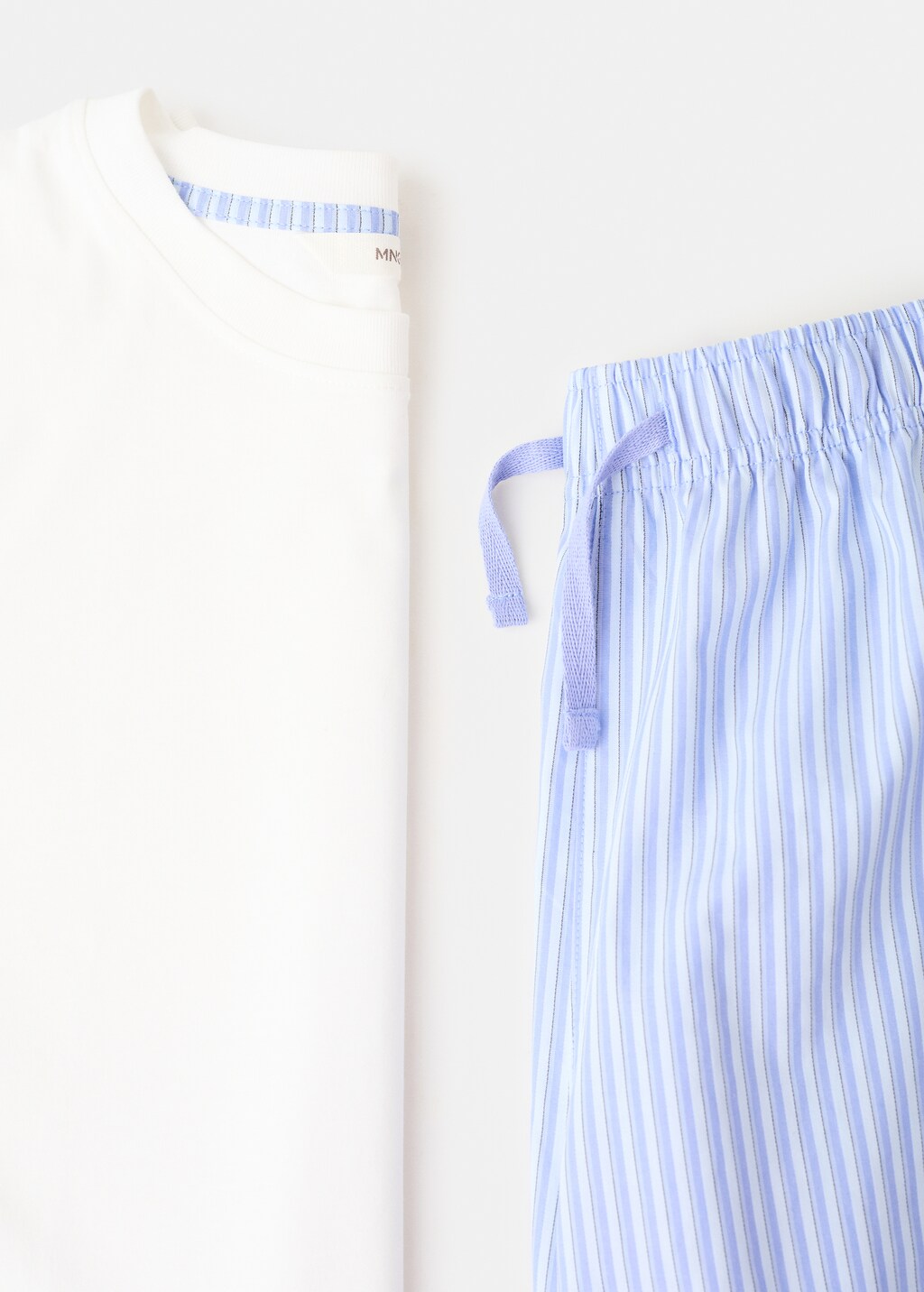 Σετ κοντομάνικη μπλούζα και κοντό παντελόνι πιτζάμας. Ύφασμα 100% βαμβάκι. Μπλουζάκι κοντομάνικο. Κοντό παντελόνι με ρίγες. Ελαστική μέση με ρυθμιζόμενο κορδόνι.