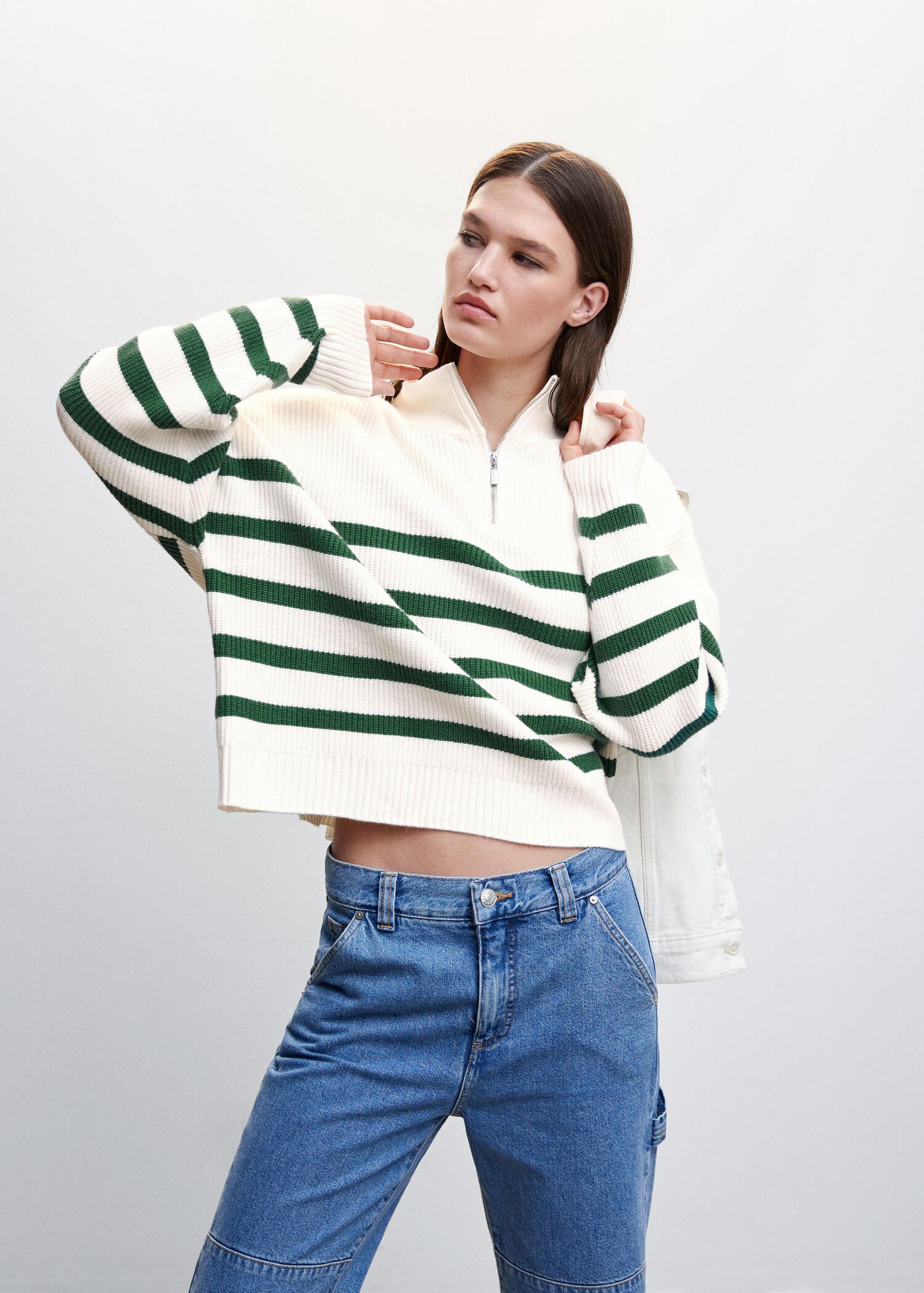 Thick knitted fabric. Straight design. Striped print. High neck with zip closure. Long sleeve. Dropped shoulder seams. Cable knit finish. Plus Size Available. The colours dark navy blue, black, sand and green are online exclusives.