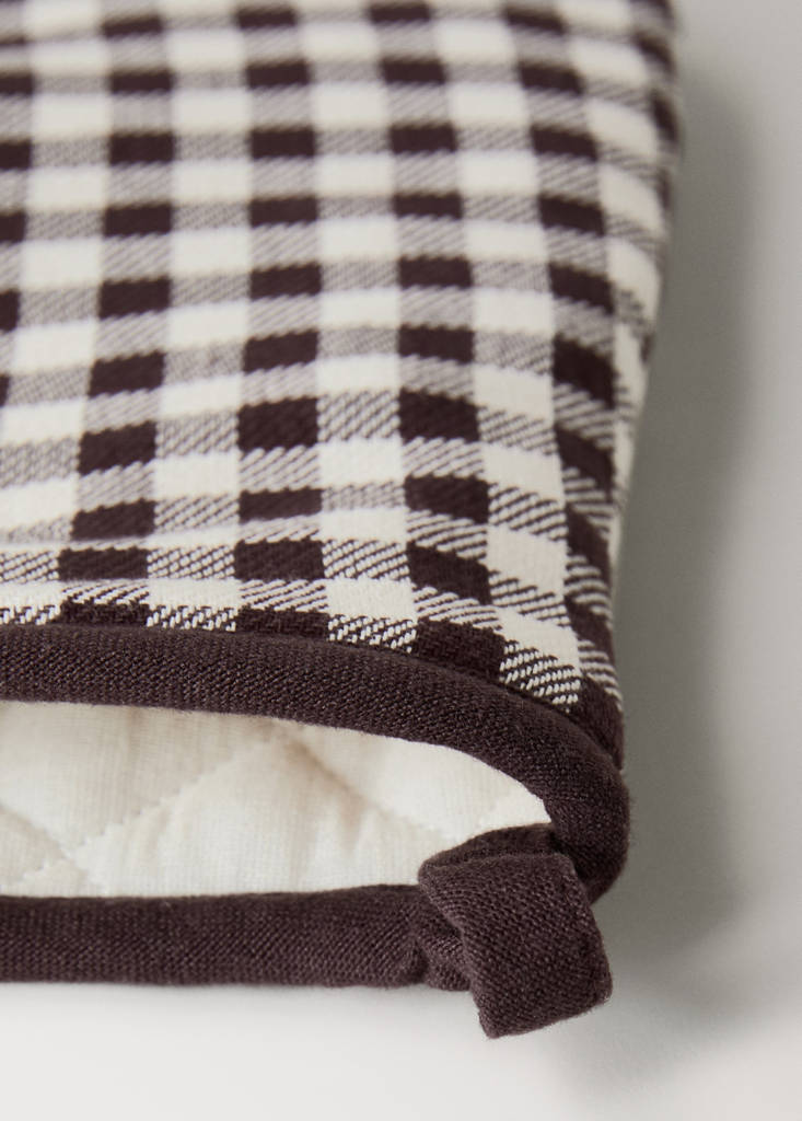 Gingham check cotton oven mittCurrent price [9.99 € ]9.99 €Select a colourGreySelect your sizeOne sizeAddAdd to your wishlistSee lookFree delivery to store100% Cotton. Vichy check pattern. Two-tone design. Add a distinctive and sophisticated touch to your kitchen. Coordinates with more products from the collectionDetails, composition and careStore availability
