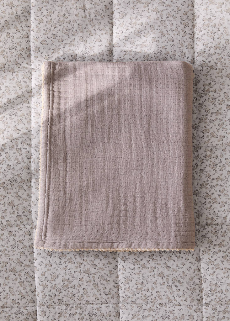 Children's blanket. Size: 70x100 cm. 100% Cotton. Soft and resistant material. Textured gauze fabric. Trim finished in crochet. Contrasting finishes. Ideal for a pleasant rest for the little ones in the house. Available in two colours. Ideal for a pleasant rest for the little ones at home