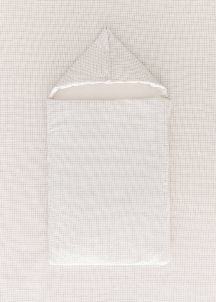 200-thread count percale cotton. Made in Portugal. Size: 50x40cm. 0 to 3 months. It features a yarn-dyed design with a mini-check pattern, giving it an elegant and timeless aesthetic, ideal for any child's room. Designed to provide comfort and protection for your baby during outings. Its quilted structure provides warmth and a pleasant texture to the touch. Ideal for any baby