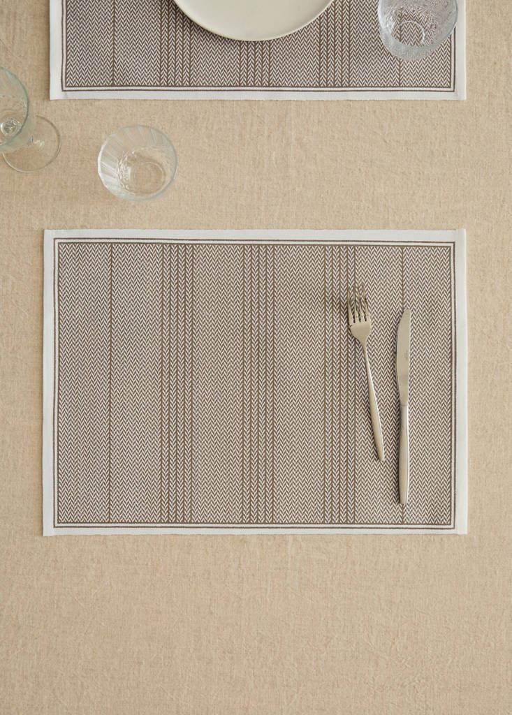 2 PACKGeometric-print placematsInitial price struck through [9.99 € ]9.99 €Current price [8.99 € ]8.99 €-10%Select a colourSandSelect your size35x50cmNot available. I want it!Notify meAdd to WishlistSee lookFree delivery to storeSize: 35x50cm. 100% Cotton. Geometric print. Two-tone design. Available in different coloursDetails, composition and careStore availability