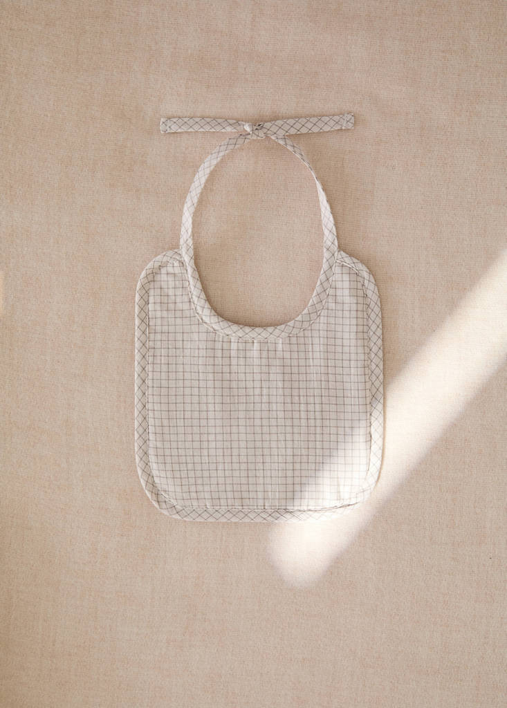 100% Cotton. Made in Portugal. Bib with a rounded design at the top and edges finished with a bias tape in the same check fabric. Closure with loop. Combine it with more products from the collection