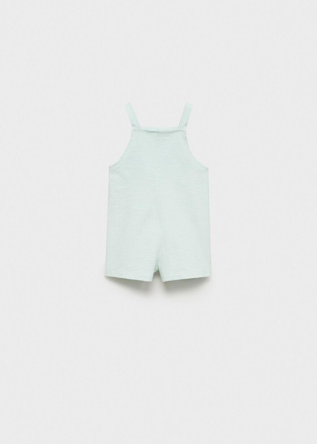 Short cotton dungareesCurrent price [12.99 € ]12.99 €Select a colourGreenSelect your size1-3 months (62cm)Not available. I want it!3-6 months (68cm)Not available. I want it!6-9 months (74cm)Not available. I want it!9-12 months (80cm)Not available. I want it!12-18 months (86cm)Not available. I want it!18-24 months (92cm)Not available. I want it!Notify meAdd to WishlistSee lookFree delivery to storeSee availability in storeDescription100% cotton fabric. Straight Design. Short design. Straight collar. Sleeveless. Thin straps. Patch pocket on the chest. Button up.See detailsItem qualitiesRecycled cottonAt least 20%This fibre is obtained from pre- and post-consumer textile waste that is transformed into new fabrics.Share