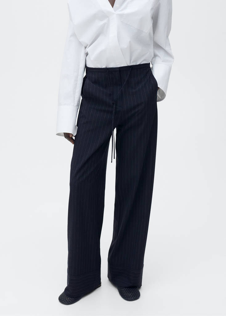Straight design. Jogger design. Long design. Pinstripe pattern. Mid-rise. Elasticated waistband. Bow on the waist. Side pockets. No Fastening. Inner lining. Pinstripe design. Hook and zip fastening