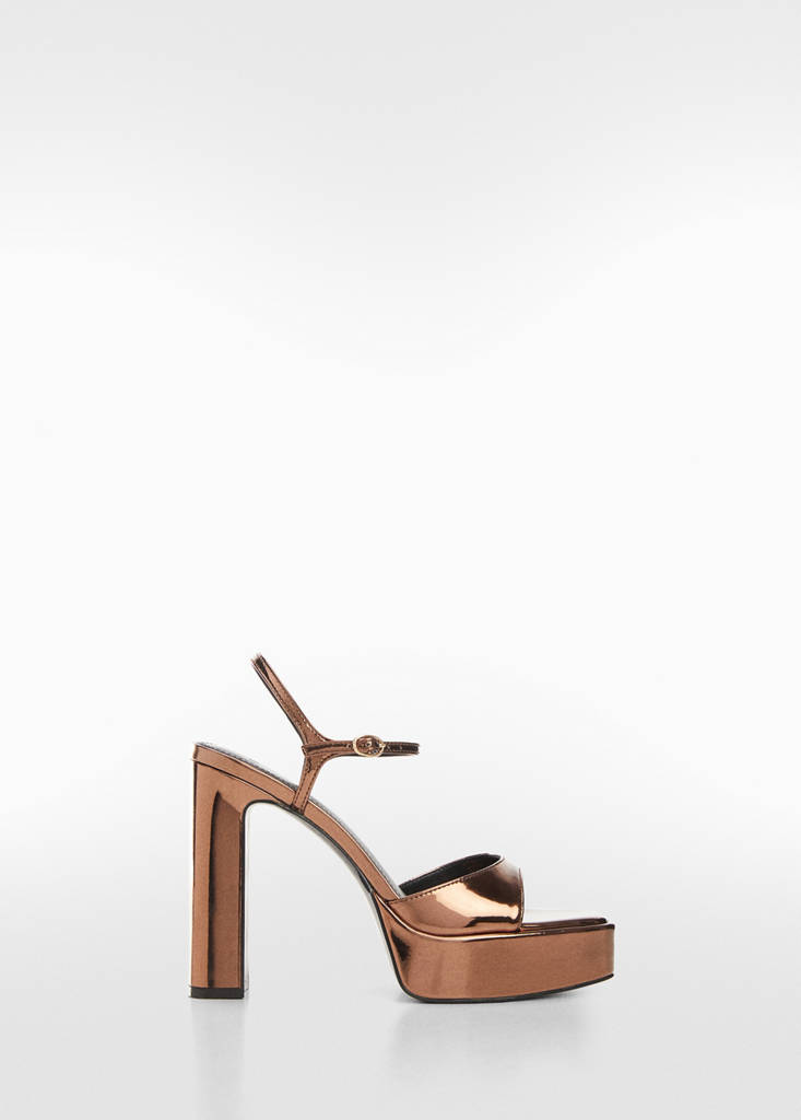 Efecto metalizado. Punta cuadrada. Plataforma. Cierre de hebilla. Pulsera en el tobillo. El tacón mide 10 cm. Colección fiesta, ceremonia y comunión