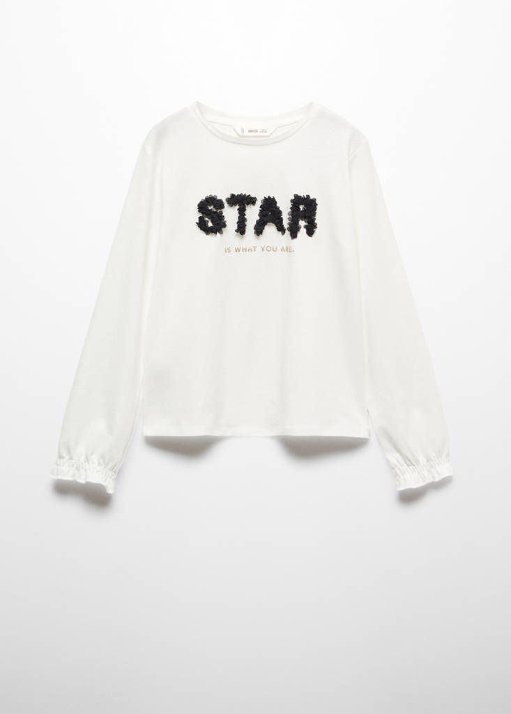 100% algodón. Mensaje estampado. Detalle bordado. Diseño recto. Detalle fruncido en los puños. Manga larga. Cuello redondo