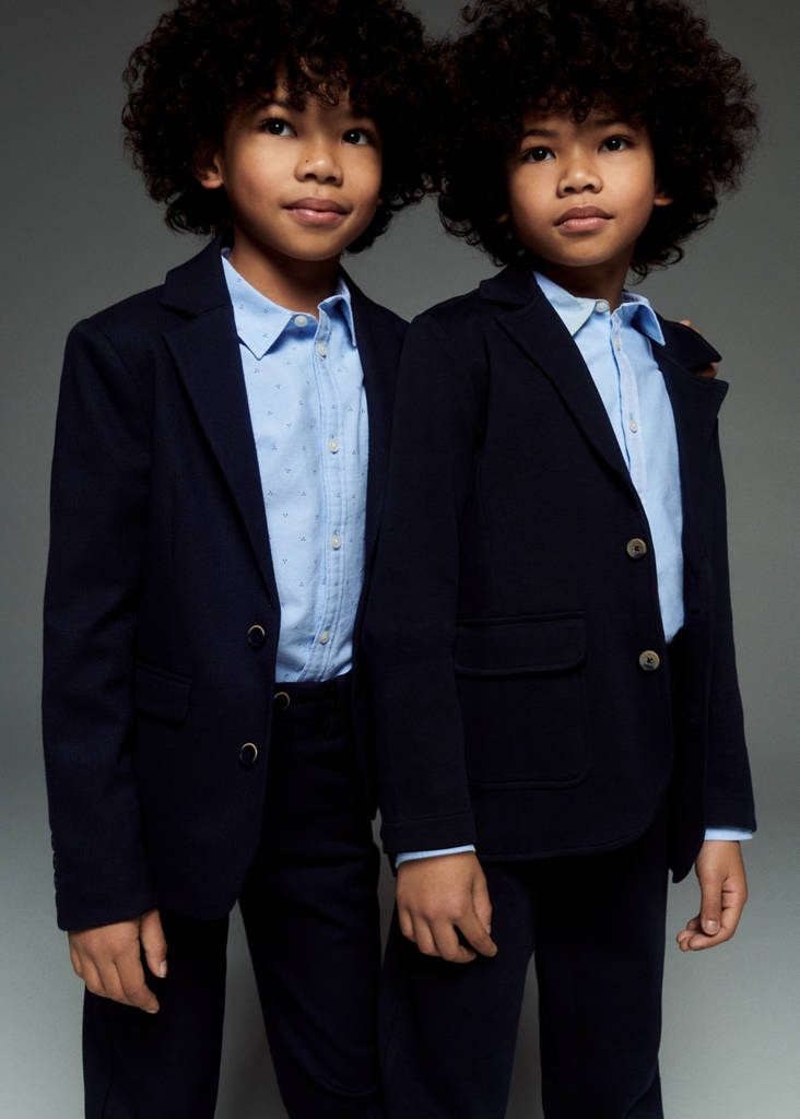 Colección fiesta, ceremonia y comunión. 100% algodón. Con textura. Regular fit. Cuello pico. Cuello de solapa. Solapas con muesca. Manga larga. Dos bolsillos delanteros. Cierre de botones