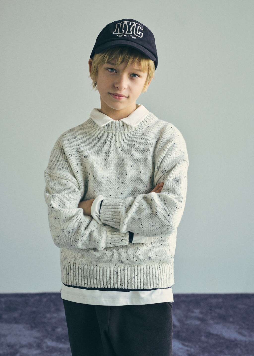 Tejido jaspeado. Tejido de punto. Tejido de lana. Diseño recto. Cuello redondo. Manga larga. Cuello, puños y bajo en canalé.