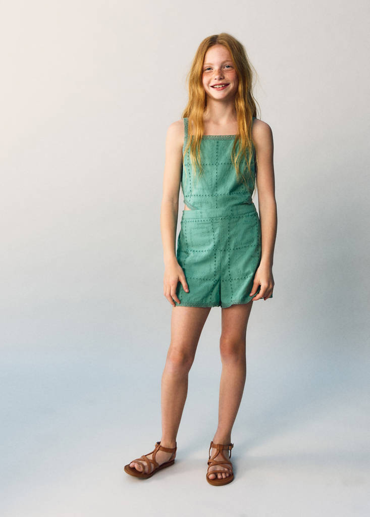100% cotton fabric. Cute design. Straight design. Short design. Straight collar. Straps. Cut-out embroidered details. Side slits