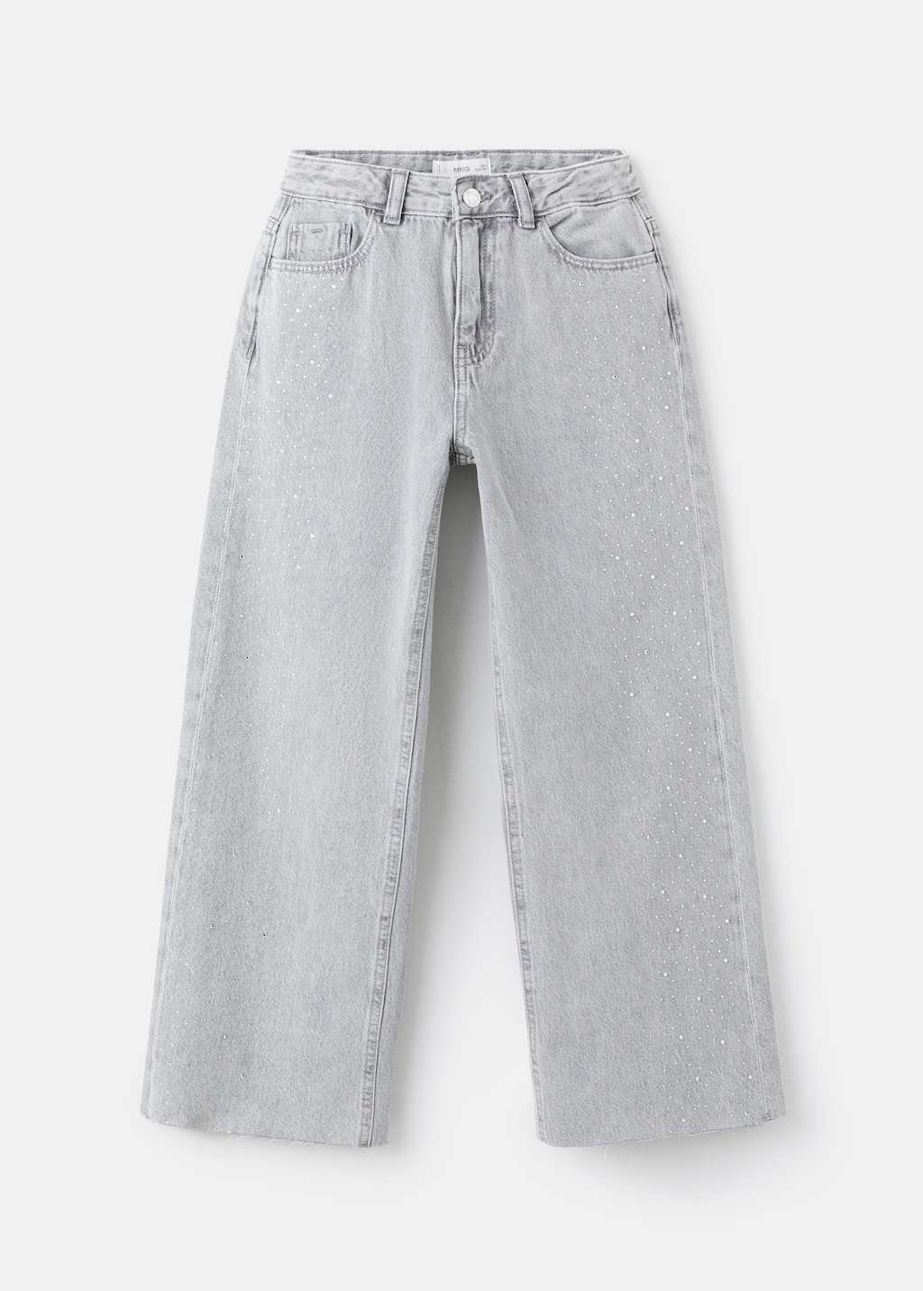 100% cotton denim-style fabric. Wide-leg design. Strass design. Long design. Belt loops. Five pockets. Front zipper and button closure. Frayed hem.