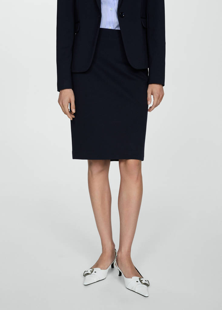 Tejido de punto roma. Diseño lápiz. Diseño midi. Tiro alto. Cierre de cremallera invisible en la parte posterior. Detalle de abertura en la parte posterior. Total look. Looks de oficina. Diseño entallado