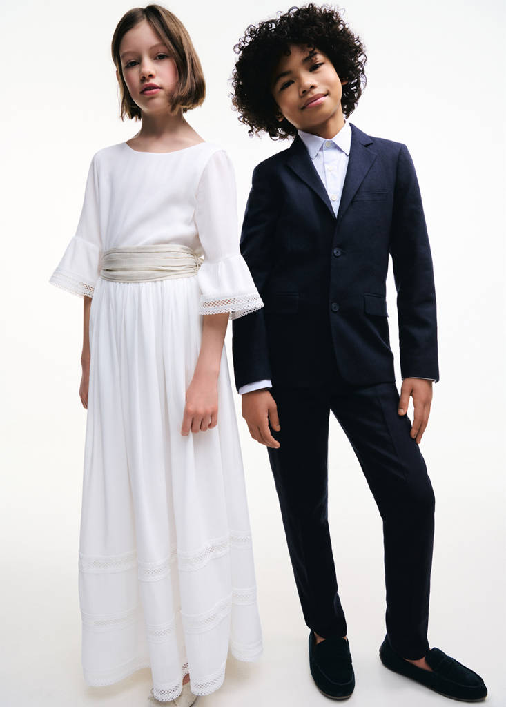 Tejido fluido. Diseño largo. Cuello redondo. Manga corta. Detalles bordados. Detalles en puntilla. Cinturón de lino. Fajín con cierre de lazo. Forro interior 100% algodón. La modelo mide 145 cm y lleva la talla 10. El largo del vestido es de 109 cm. Colección fiesta, ceremonia y comunión