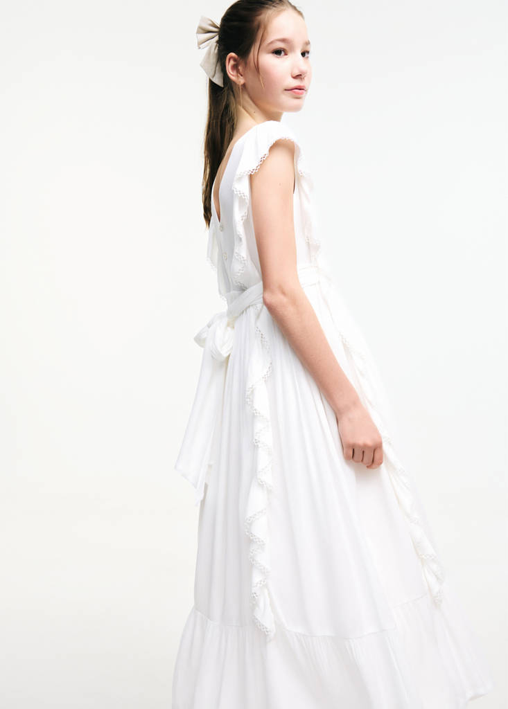 Tejido fluido. Cuello recto. Tirantes con volante. Detalle de lazo en la cintura. Detalles en puntilla. Escote de pico en la espalda. La modelo mide 145 cm y lleva la talla 10. El largo del vestido es de 109 cm. Colección fiesta, ceremonia y comunión