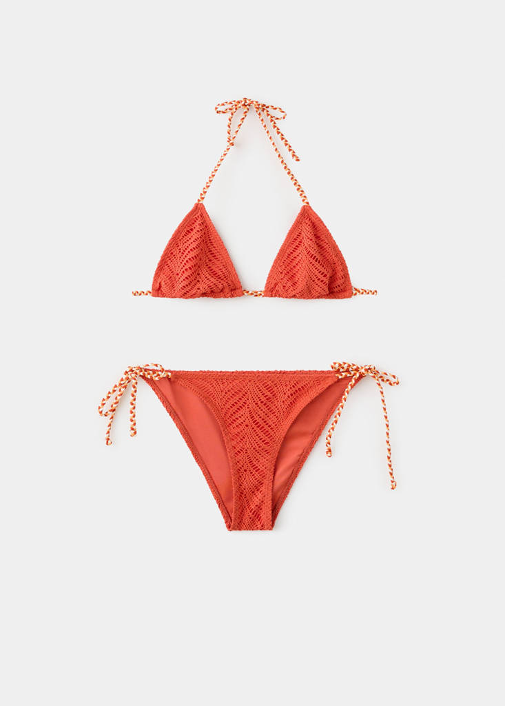 Pack de bikini. Tejido elástico. Diseño triangular. Diseño crochet. Tirantes trenzados. Cierre de lazo. Cierre de lazos laterales. Braguita media