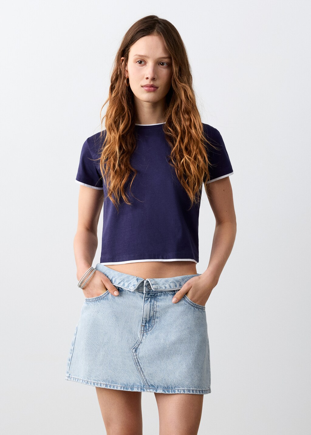Tejido de algodón estilo tejano vaquero. Diseño recto. Diseño corto. Detalle vuelta. Cinco bolsillos. Cierre de cremallera y botón.
