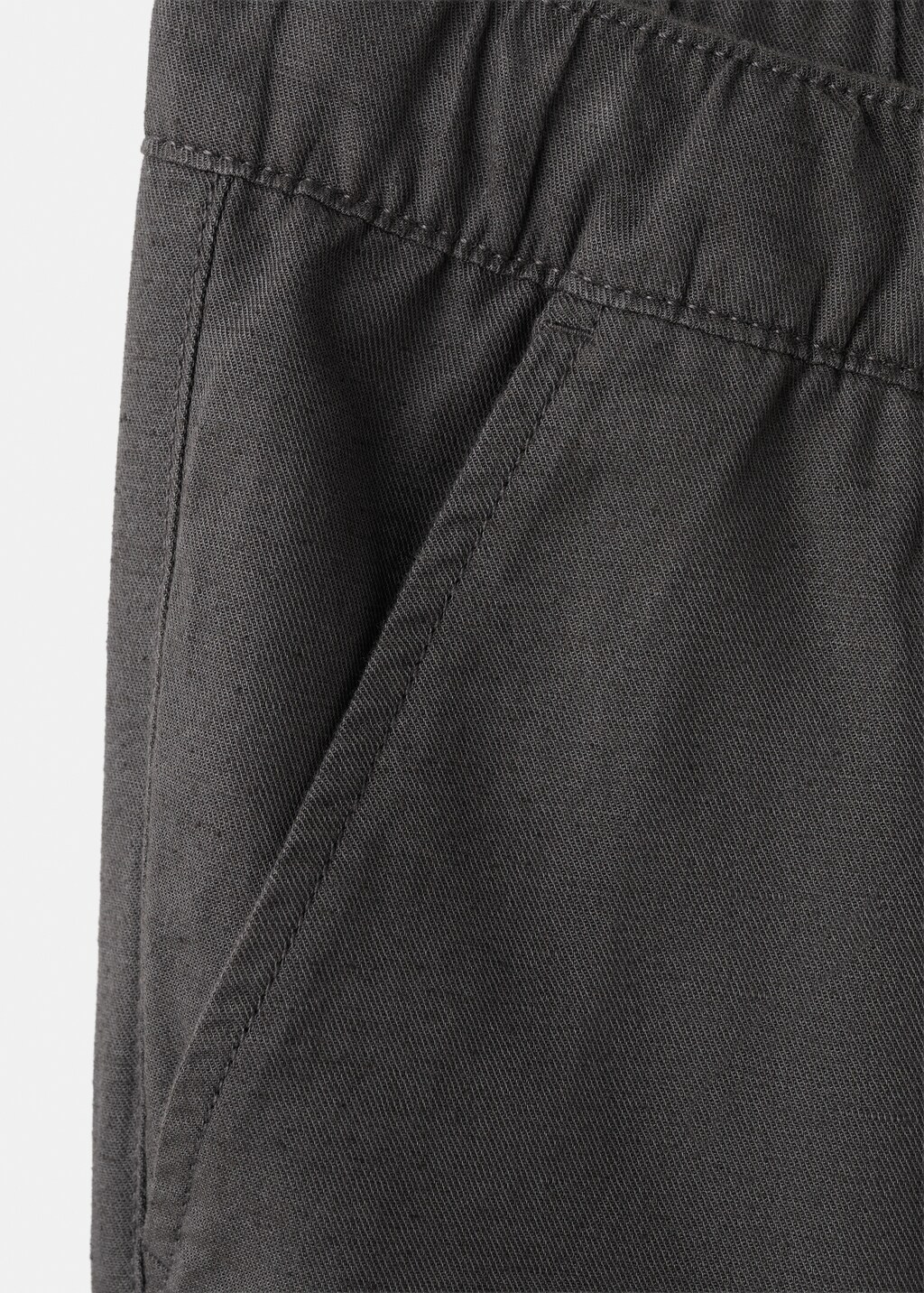 Tejido mezcla de algodón y lino. Diseño recto. Diseño largo. Cintura elástica con cordón. Dos bolsillos laterales. Cierre de botón y cordón.