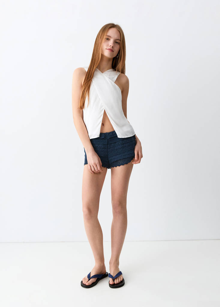 Shorts volantes crochetPrecio actual [US$ 49.99 ]US$ 49.99Selecciona un colorAzul marino oscuroCambio de tallas - Consulta la Guía de tallasSelecciona tu tallaXSSMLMedidasAñadir a FavoritosVer lookEnvío gratis a tiendaTejido 100% algodón. Terminación crochet. Diseño corto. Cintura elástica. Volantes decorativosDetalles, composición y cuidadosDisponibilidad en tienda