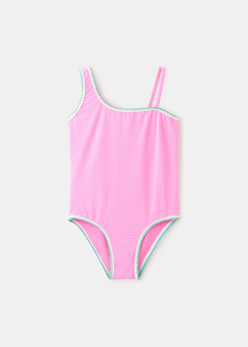 Stretch fabric. Textured with relief. Asymmetric design. Thin strap. Coloured contrasting trims. Swimwear collection.