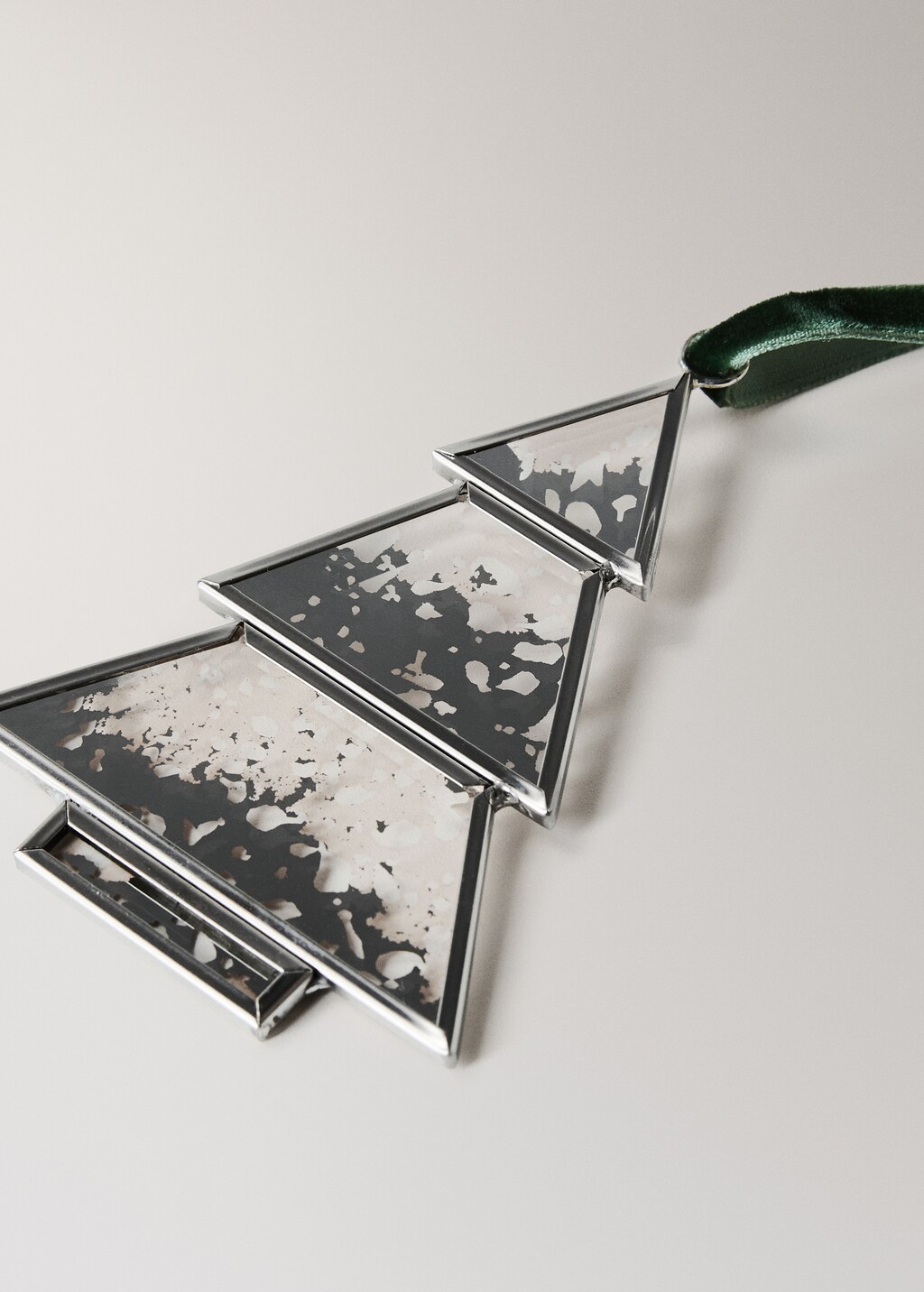 Material: 70% glass. Size: 7x9x0.3cm. This Christmas ornament is a minimalist decorative piece, ideal for elegant Christmas decorations. It consists of three staggered triangles of different sizes at the top and a small rectangle at the base representing the trunk. Inside, the crystals feature a glass sheet with a mirrored appearance and a worn finish that conveys warmth and a vintage aesthetic..