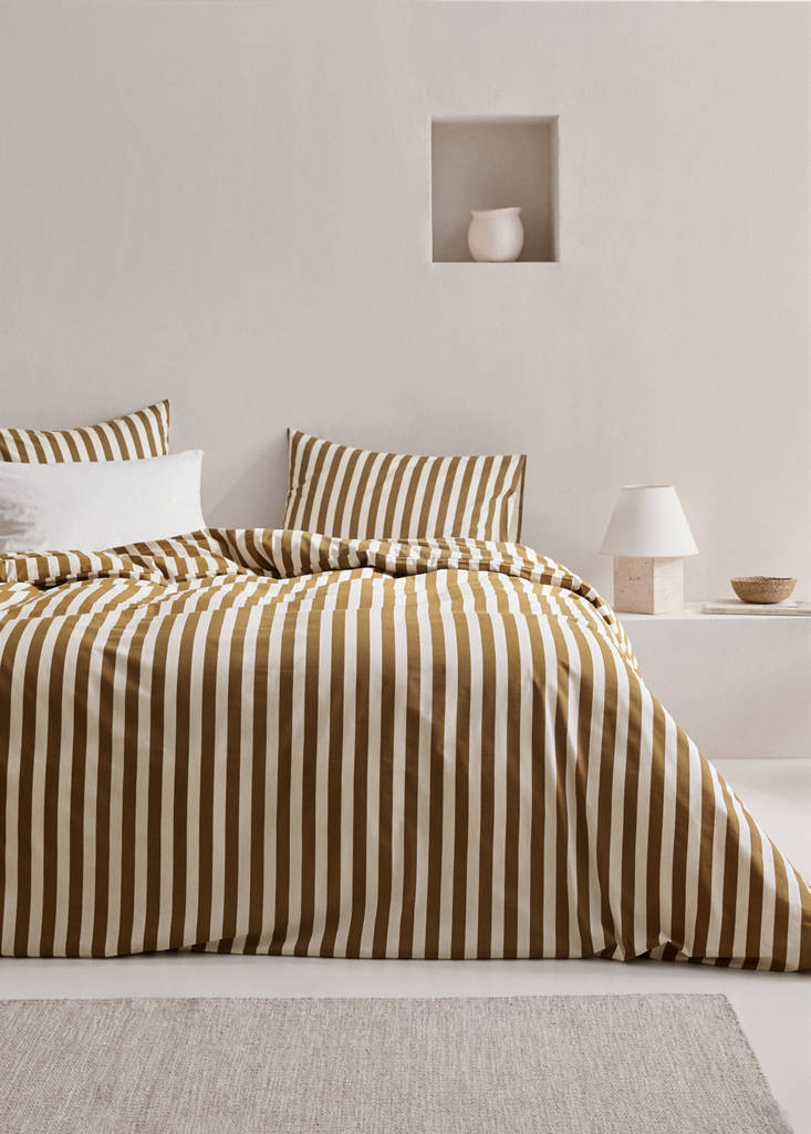 150cm Bed. Double bed. Size: 240x220cm. Percale cotton fabric, highly breathable, soft and supple. Striped print. Combine the matching cushion cover with its duvet cover to give harmony and elegance to your bedroom. Button up. Filling not included