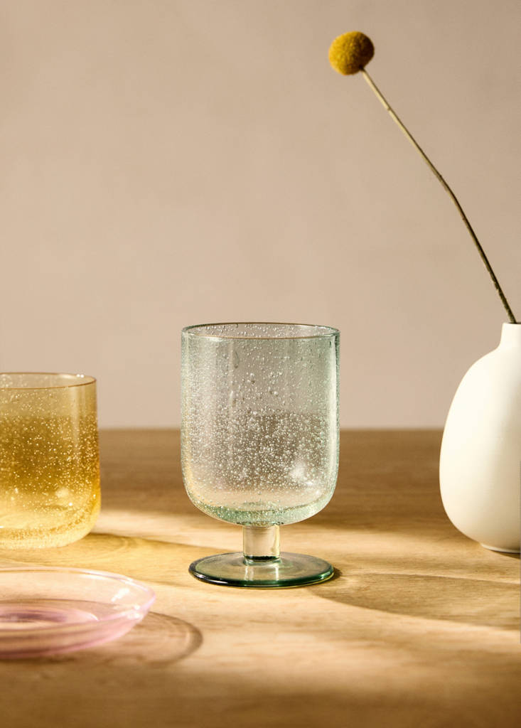100% glass. Bubble detail. These bubbles, of varying sizes, are distributed unevenly across the glass, creating a visually rich and complex texture. Cylindrical shape. Adds a colourful and original touch to your table on any occasion. Available in various colours that can be combined with each other. Dishwasher safe
